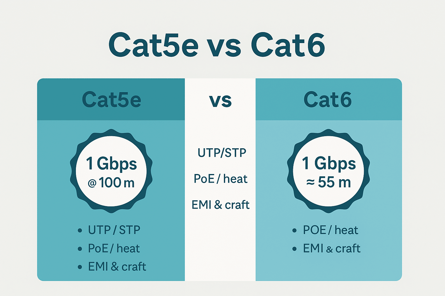 How fast is Cat5e vs Cat6? Both are 1 Gbps @ 100 m by spec. Cat6 adds a 10G window ≈ 55 m in low-EMI conditions with clean terminations. If you need guaranteed 10G at full distance, plan Cat6A (or fiber) and certify.